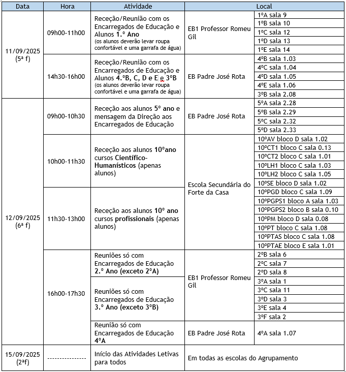 O Agrupamento de Escolas do Forte da Casa informa toda a comunidade educativa que as sessões de apresentação dos alunos e encarregados de educação decorrerão de acordo com o calendário abaixo indicado.