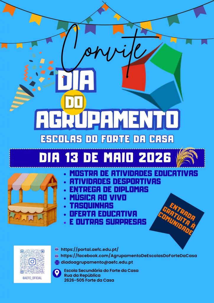 O Agrupamento de Escolas do Forte da Casa convida toda a comunidade educativa a participar no Dia do Agrupamento, que se realizará no próximo dia 13 de maio de 2026, na Escola Secundária do Forte da Casa.